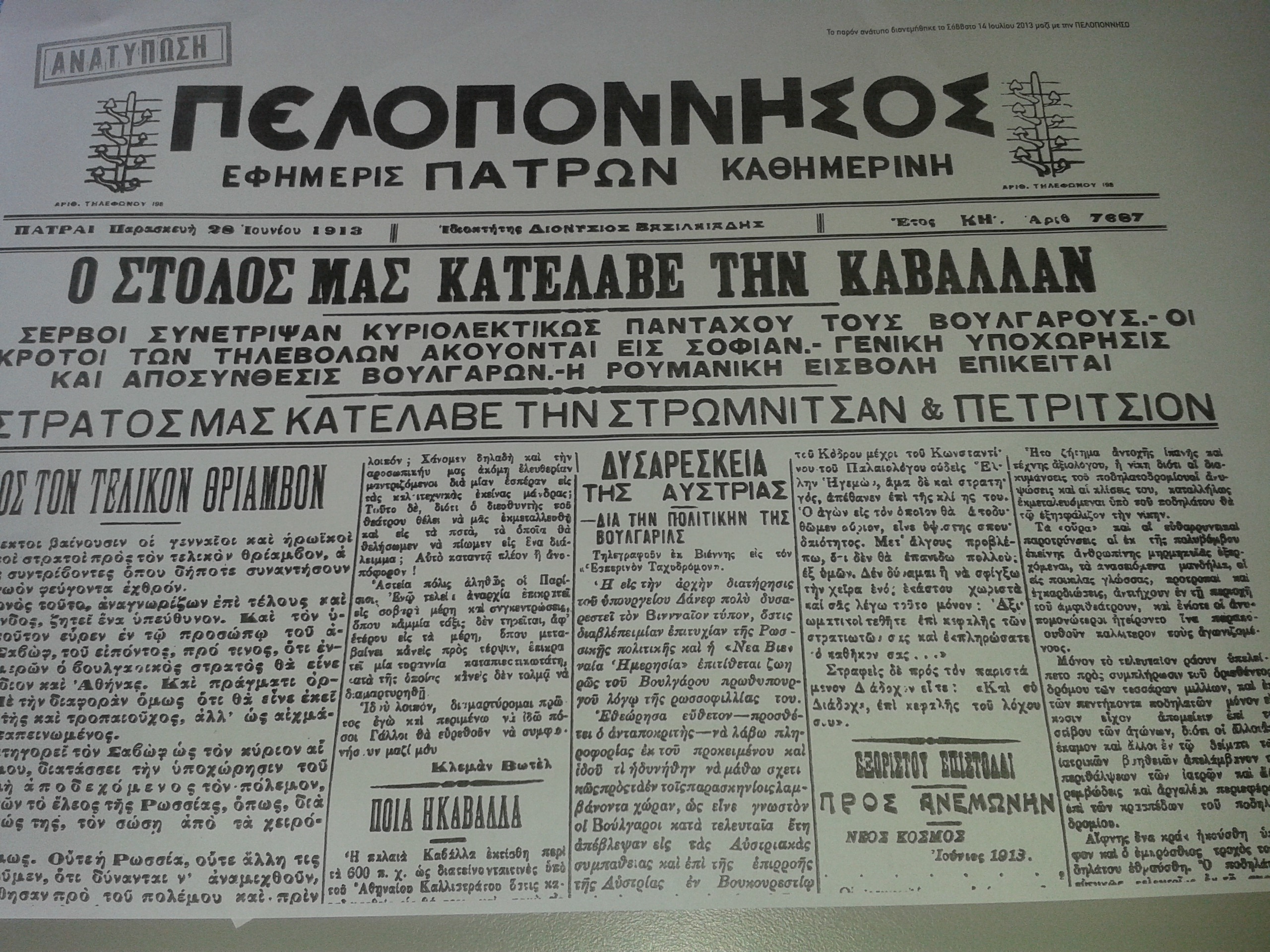 "Εξ Αβέρωφ τη 27 Ιουνίου, ώρα 5 και 30' μ.μ. Σήμερον επισήμως προκηρύχθη η κατάληψις της Καβάλας. Εκαθαρίσαμεν τα περίχωρα από τους κομιτατζήδες και ικανούς Βουλγάρους στρατιώτας αδέσποτους. Ο ενθουσιασμός είναι μέγιστος. Οι Τούρκοι συμμετέχουσι πλήρως αυτού. Κουντουριώτης."